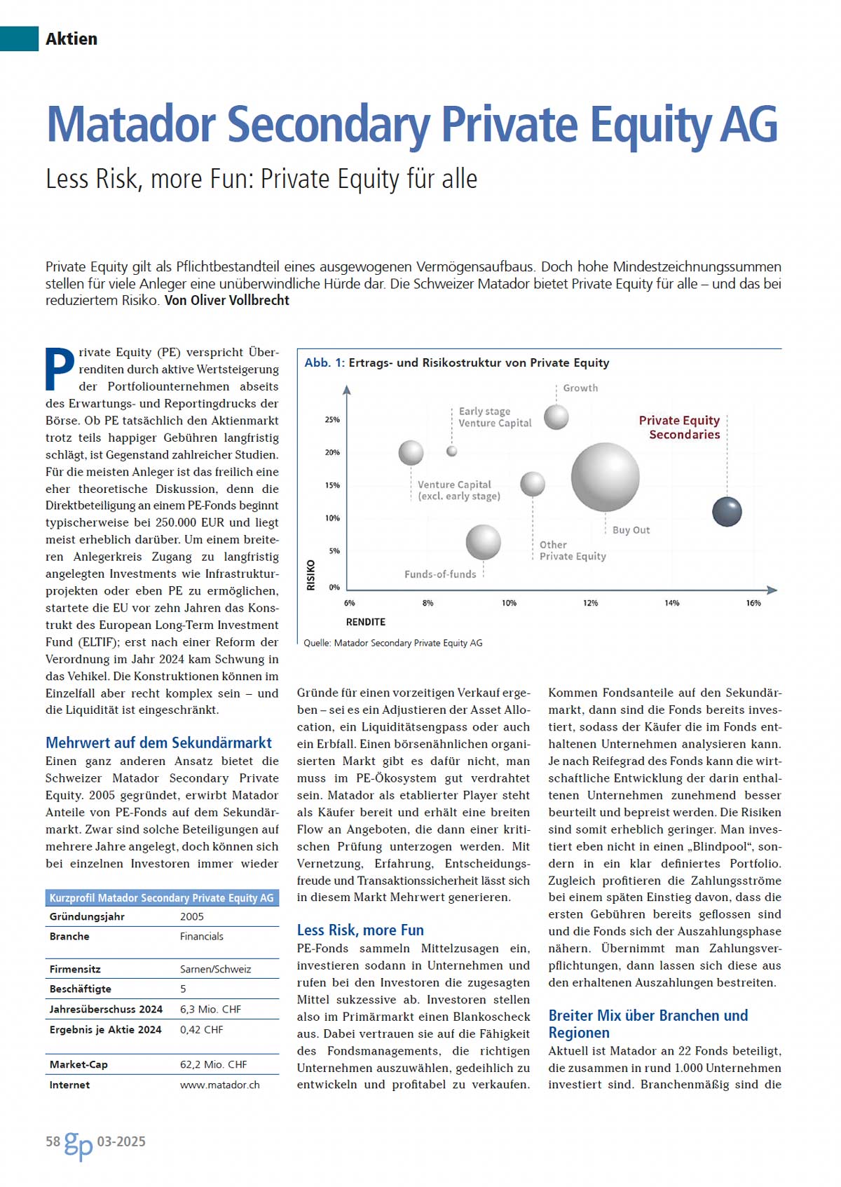 Veröffentlicht in Going Public Magazin Private Equity gilt als Pflichtbestandteil eines ausgewogenen Vermögensaufbaus. Doch hohe Mindestzeichnungssummen stellen für viele Anleger eine unüberwindliche Hürde dar. Die Schweizer Matador bietet Private Equity für alle – und das bei reduziertem Risiko. Private Equity (PE) verspricht Überrenditen durch aktive Wertsteigerung der Portfoliounternehmen abseits des Erwartungs- und Reportingdrucks [...]